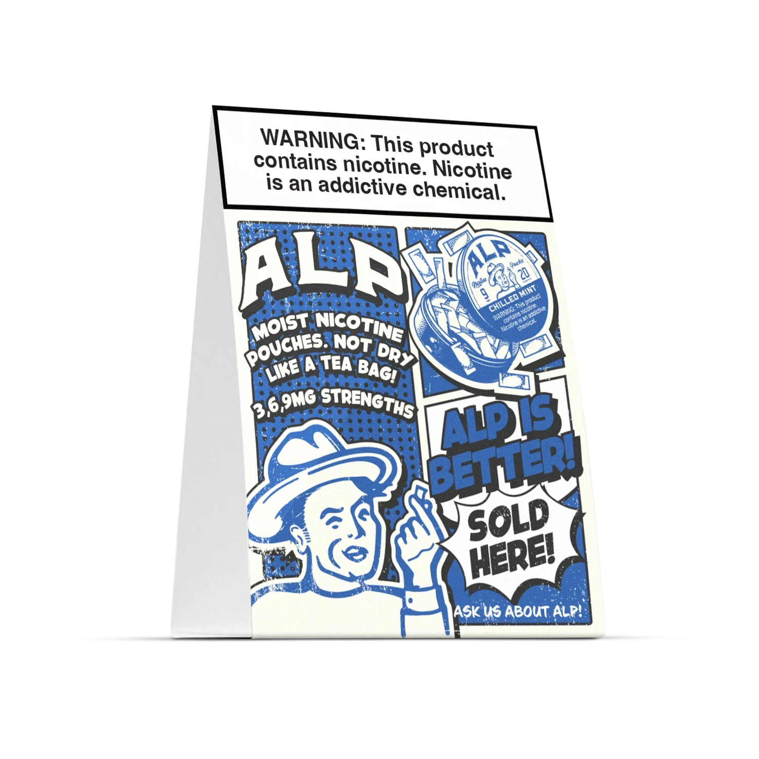 The ALP Comic Table Tent is a high-impact display piece designed to sit perfectly on countertops, register areas, and display tables. Printed on durable, high-quality stock with a sleek finish, it’s the perfect way to highlight ALP's product offering and why ALP stands above the rest. Easy to set up, hard to ignore.
